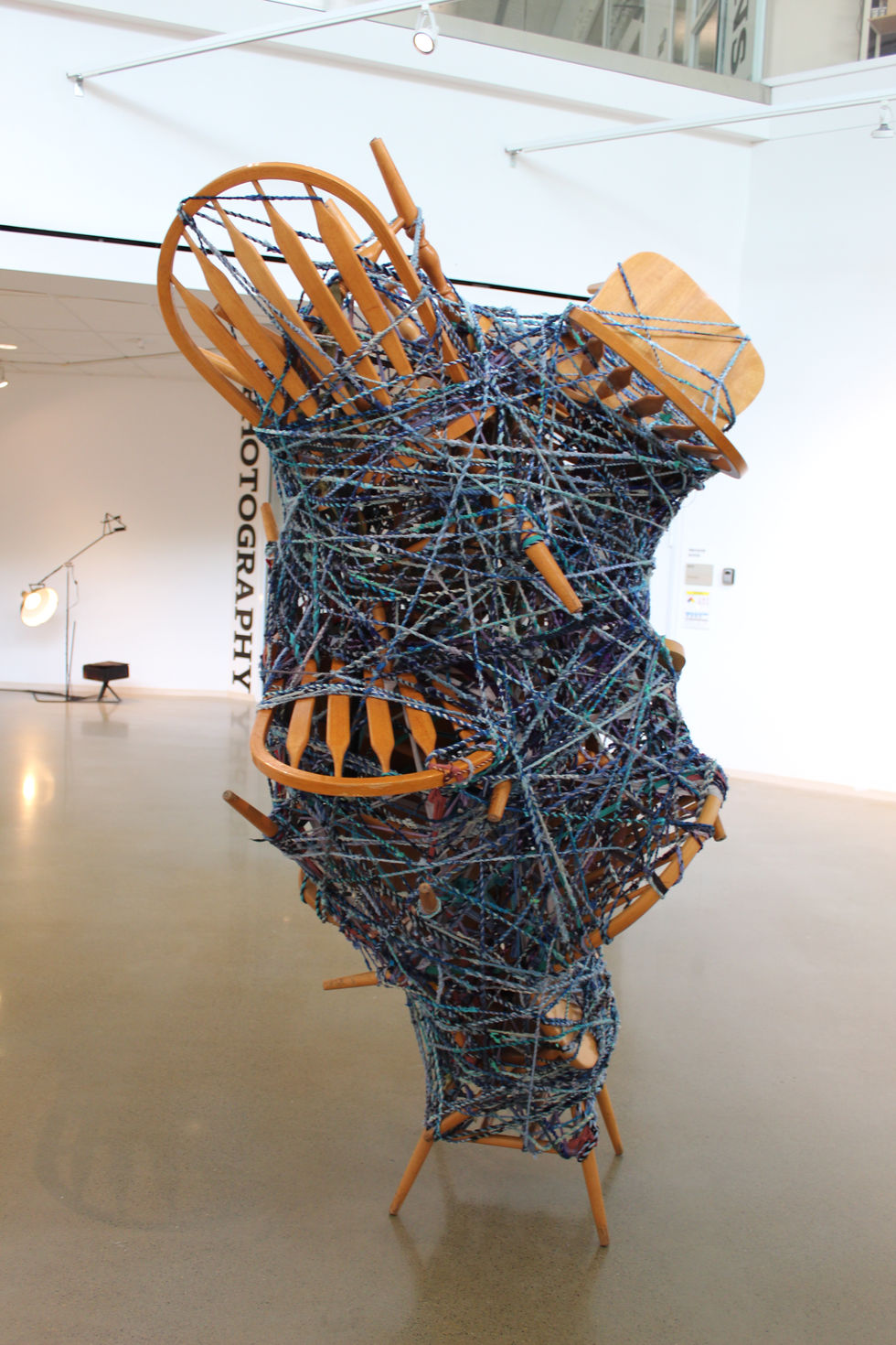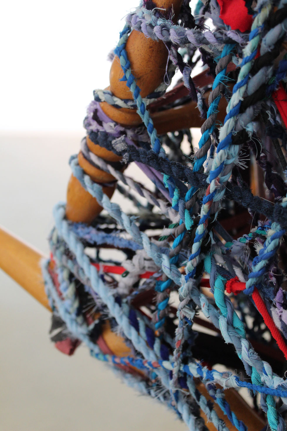 The stacked chairs in this sculpture are held together only by the cordage that binds them. These chords are made from a combination of sentimental items- worn clothing, blankets- and non sentimental repurposed textile scrap.